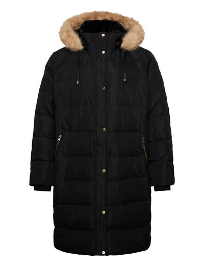 Dieser gesteppte Mantel vereint Stil und Funktionalität mit einer abnehmbaren Kapuze mit Kunstfellbesatz für zusätzliche Wärme. Das wasserabweisende Obermaterial und die 450-Fillpower-Daunenisolierung sorgen dafür, dass Sie bei kaltem Wetter trocken und komfortabel bleiben. Die vorderen und hinteren Prinzessnähte sorgen für eine schmeichelhafte Silhouette, während die mit „LRL“ gravierten Metalldruckknöpfe einen Hauch von Eleganz verleihen.