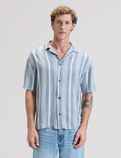 Dieses kurzärmlige Hemd ist für sommerliche Leichtigkeit gefertigt und zeichnet sich durch eine entspannte Passform und ein schlichtes, taschenloses Design aus. Der Bowlingkragen im Stil der 50er Jahre verleiht einen Hauch von Retro-Stil, während das gemischte Leinen-Viskose-Gewebe sich leicht und seidig-weich anfühlt. Die strukturierte Streifenoptik vervollständigt den Look.