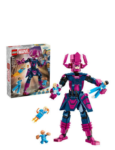 The buildable LEGO ǀ Marvel Fantastic Four toy includes 4 minifigures: Mr. Fantastic, featuring extendable legs; Human Torch, with 2 hand blasters and flame elements attached to his feet, plus a transparent support that enables him to ‘fly’; Invisible Woman holding 2 force shields; and The Thing with his large, powerful hands. A fully jointed construction figure of the film’s iconic villain, Galactus, stands over 28 cm (11 in.) tall. This posable construction figure prompts endless action as he battles the Super Heroes. For added digital fun, builders can zoom in, rotate models in 3D and track progress using the fun, intuitive LEGO Builder app. Set contains 427 pieces.
