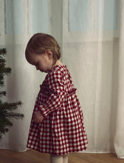Dieses Kleid mit seiner klassischen Webstruktur ist eine charmante Ergänzung für die Sammlung jedes Kindes. Das langärmlige Design umfasst elastische Bündchen und einen Rüschen-O-Ausschnitt, der Komfort mit einem Hauch von Eleganz verbindet. Es wird sowohl mit Knopf- als auch mit Druckknopfverschlüssen geschlossen.