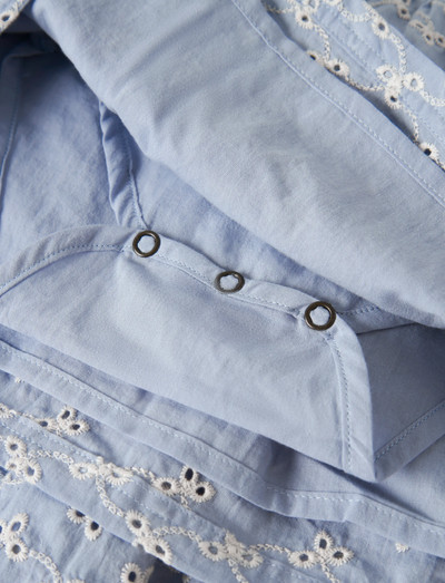 Dieses Kleid mit zarten Broderie-Anglaise-Details ist eine charmante Ergänzung für jede Kinderkollektion. Das langärmlige Design verfügt über elastische Bündchen und einen gerüschten O-Ausschnitt, was eine bequeme Passform gewährleistet. Es wird mit einem Knopf- und Schlaufenverschluss sowie Druckknöpfen geschlossen.