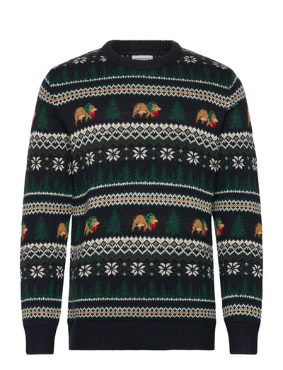 Dieser Lindbergh-Pullover hat ein festliches Winterdorf-Design mit roten Lastwagen, die Weihnachtsbäume transportieren. Er ist die perfekte Wahl für die Weihnachtszeit.