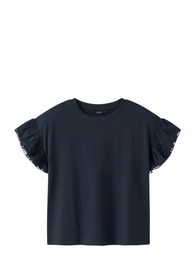 Dieses T-Shirt mit kurzen Ärmeln ist eine stilvolle und bequeme Wahl für Kinder. Es hat einen klassischen Rundhalsausschnitt und eine lockere Passform. Die Ärmel haben ein zartes Rüschendetail, das dem Design einen Hauch von Weiblichkeit verleiht.