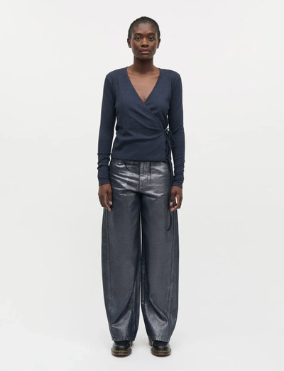 Dieses langärmlige Oberteil zeichnet sich durch einen dezenten Schimmer und eine schmeichelhafte, schmale Passform aus. Das Design verfügt über einen V-Ausschnitt und ein Wickeldetail für eine verstellbare und stilvolle Silhouette. Hergestellt aus einer Mischung aus Bio-Baumwolle, Lenzing TM Modal sowie Polyamid und Polyester, bietet es sowohl Komfort als auch einen Hauch von Eleganz.