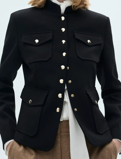 Diese Jacke verfügt über einen Stehkragen, einen Knopfverschluss und lange Ärmel. Sie hat zwei große Pattentaschen vorne und eine schmale Passform. Die Jacke ist perfekt, um jedem Outfit einen Hauch von Stil zu verleihen.