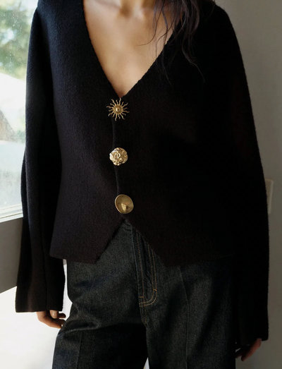 Diese Strickjacke hat einen V-Ausschnitt und lange Ärmel. Sie hat ein stilvolles Design mit Schmuckknöpfen. Die Jacke ist perfekt zum Schichten und verleiht jedem Outfit einen Hauch von Eleganz.