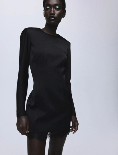 Dieses kurze Kleid wurde für besondere Anlässe entworfen und verfügt über einen offenen Rücken mit Bindeband. Das figurbetonte Kleidungsstück hat lange Ärmel, einen Rundhalsausschnitt und einen zarten Spitzenbesatz am Saum. Es wird mit einem Reißverschluss auf der Rückseite und einem Knopf im Nacken geschlossen und hat ein Innenfutter.