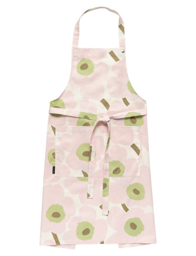 The Pieni Unikko pattern apron is printed in Helsinki. The apron has a front pocket and an adjustable neck band.