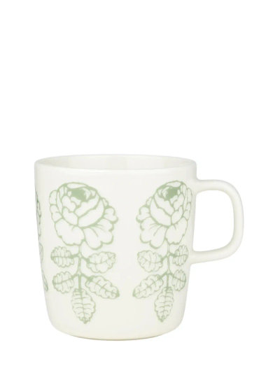The Vihkiruusu pattern Oiva mug is made of whiteware. The mug is dishwasher, oven, microwave, and freezer safe.