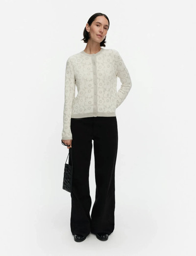 Diese Strickjacke mit floralem Jacquardstrickmuster bietet eine schmale, gerade Passform. Das Kleidungsstück ist aus einer weichen Mischung aus Merinowolle und Bio-Baumwolle gefertigt. Sie hat einen O-Ausschnitt und eine Knopfleiste. Schmale Rippbündchen schließen die Ärmelenden und den Saum ab.
