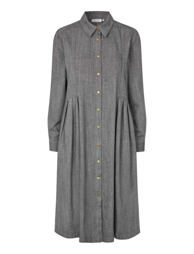Mit ihrem durchgeknöpften Design bietet dieses Kleid vielseitige Styling-Optionen. Die dezenten Falten sorgen für einen Hauch von Eleganz, während die langen Ärmel es für kühlere Tage geeignet machen.