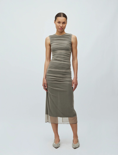 Dieses Kleid mit figurbetonter Silhouette ist mit schmeichelhaften Raffungen versehen. Das ärmellose Design und die Midi-Länge machen es zu einer vielseitigen Wahl für verschiedene Anlässe.