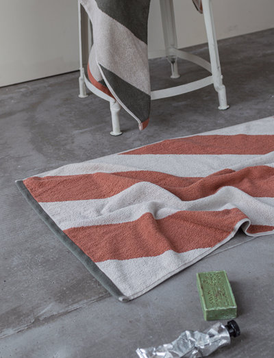Enhance your bathroom with the stylish DIAGONAL bath mat from Mette Ditmer. The diagonal stripes in olive green and sand create a calm palette that suits both modern and classic interiors. The brick red border adds an elegant finish, while the orange loop and label provide a playful contrast.