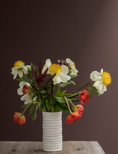 RIBBON is a porcelain series based on Mette Ditmer's handmade ceramics. The original works are created from several ribbons of clay, which are put together into a form that has a simple and beautiful expression. You can feel the hand-made look with fingerprints on the raw and unglazed surface, which is a nice contrast to the glazed inside of the products. The RIBBON vase in small is perfect for beautiful flowers all year round, but is also particularly beautiful at Christmas time, when leafless branches or spruce can be used in the vase. Mix with the other products in the series.