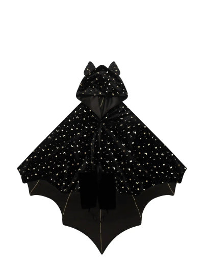 Black cape with bat shape and hood with pointy ears. The cape is decorated with hundreds of small, golden bats.