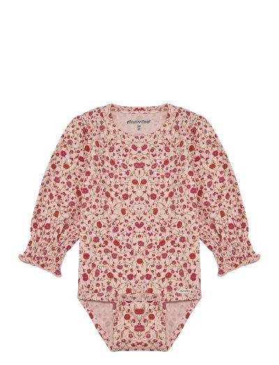 Long-sleeved bodysuit from Minymo. The bodysuit has an all-over print with elastic cuffs with pleats. It closes with snap buttons between the legs. The bodysuit is made of a cotton blend. Certified acc. to GOTS - organic CERES-0366