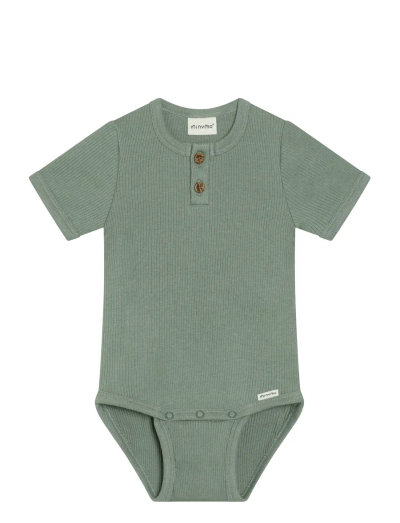 Short-sleeved bodysuit from Minymo. The bodysuit is made from a solid-colored rib fabric. It fastens with adjustable snap buttons between the legs. The bodysuit is made of a cotton blend. This product contains TENCEL™ fibers. TENCEL™ is a trademark of Lenzing AG