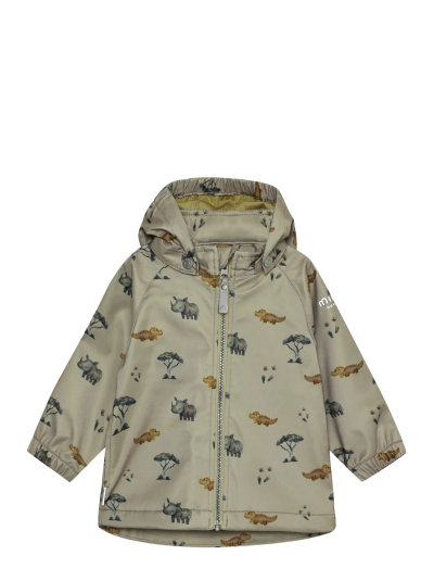 Softshell jacket with all-over print from Minymo. The jacket has a water column pressure of 8,000 mm and a breathability of 3,000 g/m². It is windproof, has reflective details, and is made of a 3-layer fabric. Additionally, the jacket features a detachable hood. Coated with BIONIC FINISH® ECO