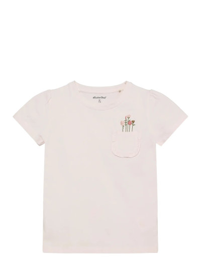 Short-sleeved T-shirt from Minymo with a chest pocket. The shirt features lightly puffed sleeves and a round neckline. The front is adorned with both a print and a chest pocket. Certified acc. to GOTS - organic CERES-0366