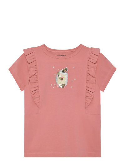 Short-sleeved T-shirt with frills from Minymo. The T-shirt features frills around the shoulder area and a print on the front.