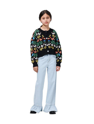 Bootcut fitLight denim trousers featuring elegant ruffle details at the pockets and hem. This model includes four pockets, belt loops, and an adjustable waistband for a perfect fit. The smaller sizes (92-134) come with a convenient snap button, while sizes 140-176 feature a classic jeans button, ensuring comfort and usability for children of all ages.
