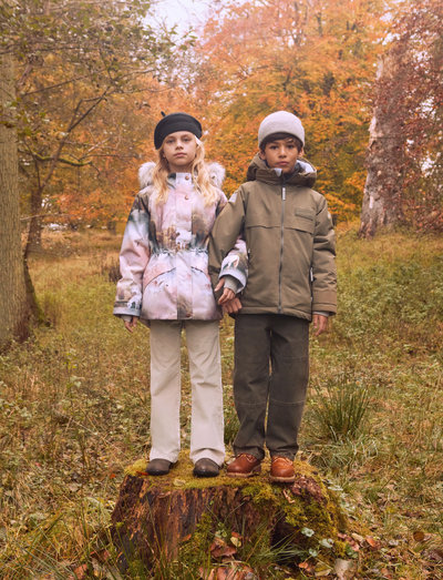 This wind and waterproof winter jacket in recycled nylon is made by Molo. The jacket has a detachable lined hood with a faux fur collar, a zipper with a flap, lined zip pockets, a snow guard in the sleeves, and an adjustable elastic at the waist that effectively keeps the wind out. The jacket is equipped with a large reflector on the back. Furthermore, the jacket is lined with fleece and padded with 3M™ Thinsulate™.