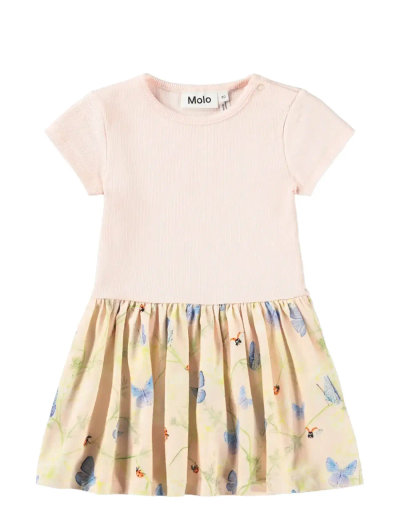 This delightful dress is crafted from soft cotton, designed for little ones to enjoy comfort and style. The top features short sleeves and a snug ribbed fit, complemented by a voluminous skirt that adds playful charm. A convenient snap button on the shoulder ensures easy dressing, making this a perfect choice for everyday adventures and special occasions alike.