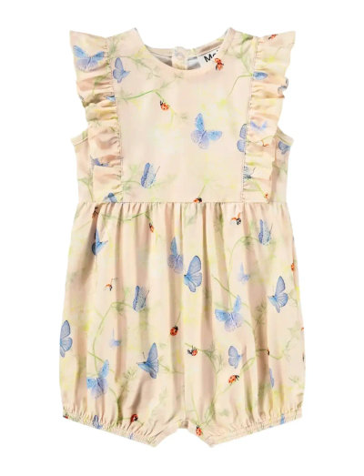 A delightful romper designed for little ones, crafted for comfort and style. This sleeveless piece features charming ruffle accents and short legs with elastic detailing for unrestricted movement. Convenient snap buttons at the back and between the legs ensure effortless dressing, making it the ideal choice for sunny days of play and adventure.