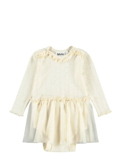 Long-sleeved bodysuit crafted from cotton pointelle for babies, featuring babylock edges for a smooth finish. The charming ruffle at the neck and lightly attached skirt add a playful touch. Snap buttons on the shoulders and between the legs ensure easy dressing, making it a practical choice for everyday wear. A delightful addition to your little one's wardrobe.