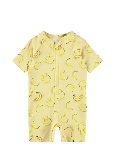 This delightful swimsuit is designed for little ones who love to splash around. Featuring short sleeves and legs, it provides an excellent fit for active kids. With a convenient front zip and stand-up collar, changing is a breeze, while special space for a nappy ensures comfort. Made from high-quality materials, this piece also offers superior UV protection for safe fun in the sun.