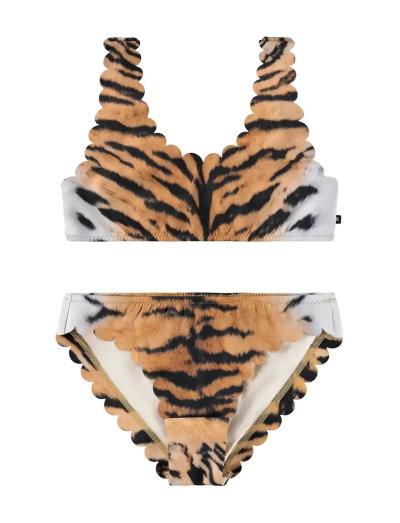 Bikini designed with playful wavy edges, perfect for active kids. The top features wide straps and a deep back for enhanced comfort during playtime. The classic-fitting bottom is fully lined for added durability, and an elastic waistband ensures a snug fit, making it an excellent choice for days spent splashing in the water. Ideal for adventurous summertime fun.