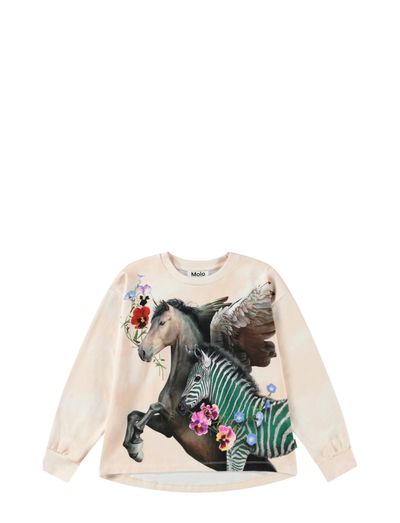 A white and powder-colored long-sleeved blouse in organic cotton with a loose fit, round neckline, and ribbed cuffs. The blouse is longer at the back than at the front. There is a festive print on the front featuring a horse with wings and a zebra with green stripes, both carrying colorful flowers in their mouths.