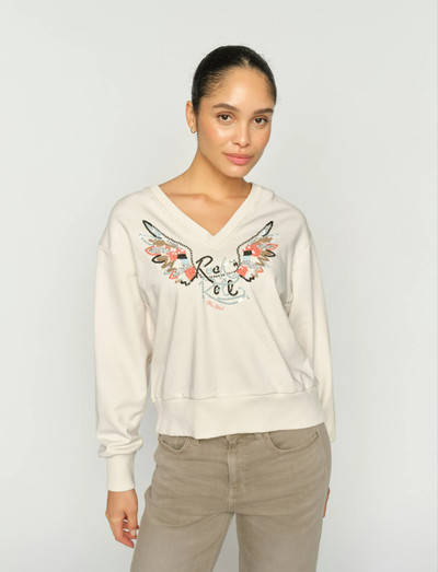 Dieses Sweatshirt zeichnet sich durch einen V-Ausschnitt und eine lockere Passform aus, was es zu einer bequemen und dennoch stilvollen Wahl macht. Der auffällige Grafikdruck auf der Vorderseite verleiht eine persönliche Note, während die langen Ärmel es perfekt für kühlere Tage machen.
