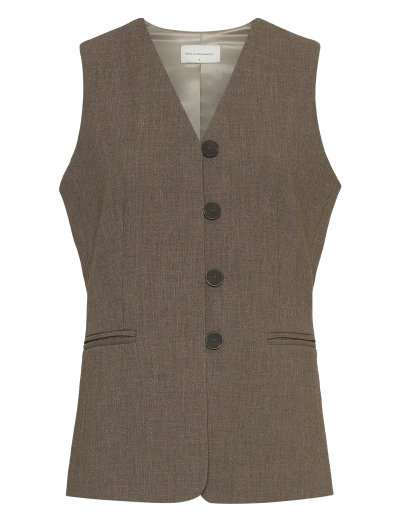Mit ihrer taillierten Silhouette bietet diese Weste eine elegante Option für den Lagenlook. Das ärmellose Design verfügt über einen V-Ausschnitt und einen Knopfverschluss vorne, was sie zu einer vielseitigen Ergänzung für jede Garderobe macht. Paspeltaschen sorgen für eine funktionelle Note.