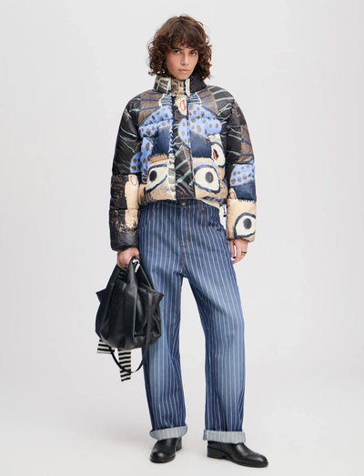 Diese elegante, kurze Pufferjacke besticht durch einen auffälligen Allover-Kunstdruck und bietet sowohl Stil als auch Wärme. Sie verfügt über praktische Taschen, einen verdeckten Knopfverschluss und einen verstellbaren Kordelzug am Saum. Die einzigartige Platzierung des Drucks sorgt dafür, dass keine Jacke der anderen gleicht.