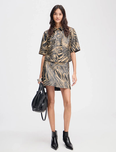 Dieser kurze Rock aus geschmeidigem Leder besticht durch einen auffälligen Allover-Print. Er ist figurbetont geschnitten und verfügt über dezente, schräge Eingrifftaschen sowie einen Reißverschluss auf der Rückseite.