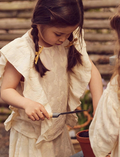 Dieses leichte und luftige Oberteil aus gewebter Baumwolle besticht durch zarte Rüschen und einen dezenten Blumendruck. Es ist auf Tragekomfort ausgelegt und verfügt über einen Knopfverschluss am Hals. Hergestellt aus GOTS-Bio-zertifizierter Baumwolle.
