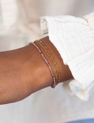 Dieses mehrlagige Armband mit feinen Ketten und dezenten Perlen verleiht jedem Look einen Hauch schlichter Eleganz. Die verschiedenen Stränge erzeugen eine optisch ansprechende Textur, die sich perfekt zum Stapeln mit anderen Armbändern eignet oder einzeln getragen ein minimalistisches Statement setzt.