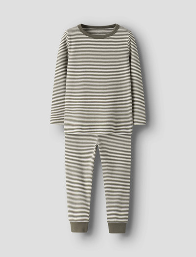 Sorgen Sie dafür, dass Ihr Kind in diesem weichen Schlafanzug-Set bequem schläft. Der gerippte Strickstoff hat ein Streifenmuster und bietet eine ausgezeichnete Elastizität, die für eine bequeme Passform sorgt. Das Set besteht aus einem langärmeligen Oberteil und einer passenden Hose mit elastischem Bund und Rippbündchen. Ein wiederholter Druck sorgt für eine spielerische Note.