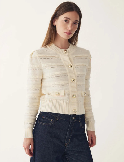 Diese langärmlige Strickjacke besticht durch ein wunderschönes, strukturiertes Strickmuster und verleiht einem klassischen Stil eine moderne Note. Die asymmetrischen silberfarbenen Knöpfe runden den Look ab.