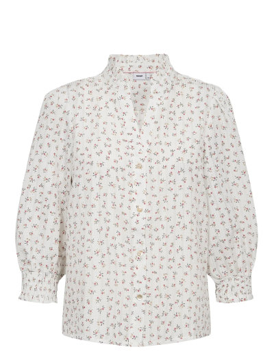 Diese langärmlige Bluse mit zartem Blumendruck verleiht jedem Ensemble einen Hauch von Eleganz. Das Design verfügt über einen hohen Halsausschnitt und eine Knopfleiste vorne, ergänzt durch leicht bauschige Ärmel und geraffte Bündchen für eine raffinierte Silhouette.