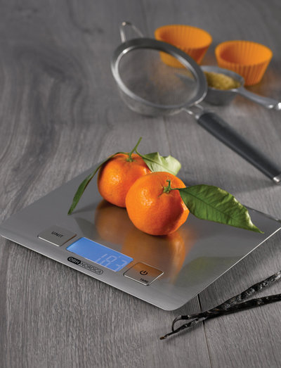 Electronic kitchen scale - only 14 mm thin, with stainless steel coating to help prevent fingerprints. Large LCD display and reset function makes it possible to weigh all ingredients in the same bowl.