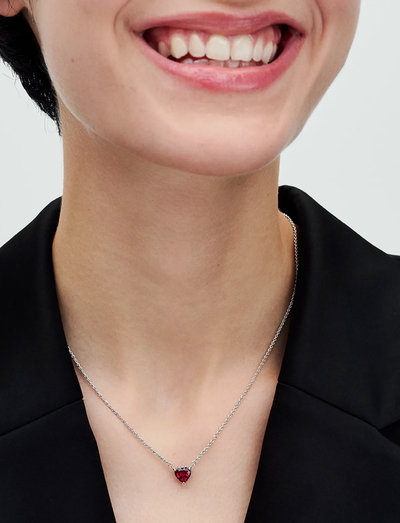 Ein herzförmiger, roter Kristall steht im Mittelpunkt dieser Halskette aus Sterlingsilber. Der Anhänger ist an einer verstellbaren Kette befestigt, was ein vielseitiges Styling ermöglicht. Pavé-Details sorgen für zusätzlichen Glanz und strahlen Liebe aus jedem Winkel aus. Ein Logostab und ein kleiner, runder Zirkoniastein vervollständigen den Verschluss.