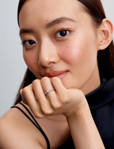 Ein herzförmiger, rosafarbener Kristall steht im Mittelpunkt dieses bezaubernden Rings. Das Sterlingsilberband ist mit glitzernden, rosafarbenen Emaille-Details versehen, die eine verspielte Note verleihen. Tragen Sie ihn als Erinnerung an die Selbstliebe.