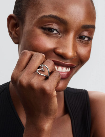 Ein offenes Herz definiert diesen skulpturalen Ring und verleiht jedem Look einen Hauch von Romantik. Das dezent gewellte Band aus Sterlingsilber teilt sich, um das Herz zu formen, das horizontal über den Finger verläuft. Das erhöhte Design setzt ein elegantes, modernes Statement und passt gut zu anderen minimalistischen Schmuckstücken.