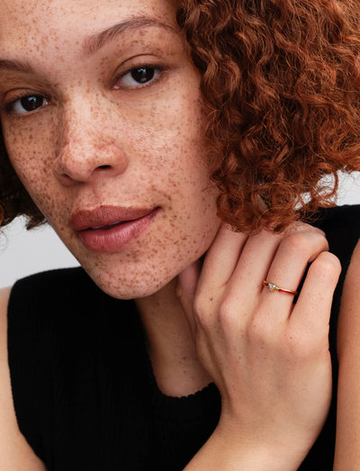 Inspiriert vom legendären Superhelden, verfügt dieser Ring über einen dreieckigen Stein und die Gravur 'ARMOR UP'. Die 14-karätige Vergoldung sorgt für einen Hauch von Luxus, während die roten Emaille-Details für einen lebendigen Farbakzent sorgen.