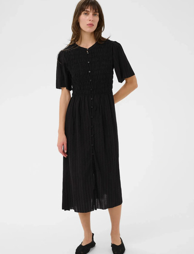Dieses Midikleid mit Knopfleiste vorne und gesmoktem Oberteil bietet eine schmeichelhafte Silhouette. Die kurzen Ärmel sorgen für luftigen Komfort und machen es ideal für warmes Wetter.