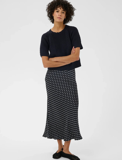 Dieser Rock aus einem glatten, fließenden Stoff bietet einen angenehmen und eleganten Fall. Sein schlichtes Design macht ihn zu einer vielseitigen Ergänzung für jede Garderobe, die sich für verschiedene Anlässe leicht auf- oder abtragen lässt.