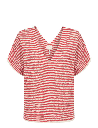 Dieses kurzärmelige Oberteil mit lockerer Passform und V-Ausschnitt ist eine bequeme und stilvolle Option für warmes Wetter. Die horizontalen Streifen sorgen für einen zusätzlichen Blickfang und machen es zu einem vielseitigen Kleidungsstück für den Alltag.