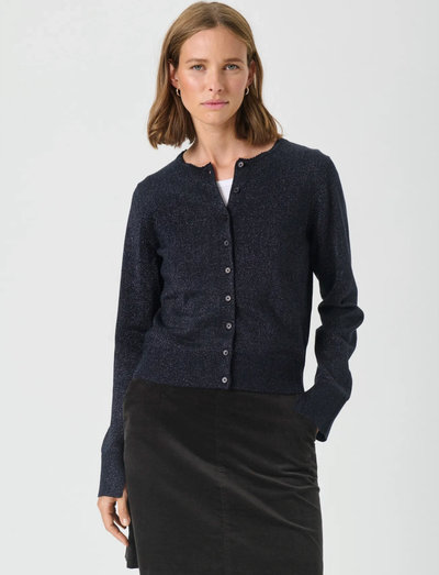 Dezenter Schimmer verleiht dieser klassischen Strickjacke eine besondere Note und macht sie zu einem vielseitigen Kleidungsstück für Lagenlooks. Das Design mit Knopfleiste und langen Ärmeln sorgt für einen zeitlosen Look.